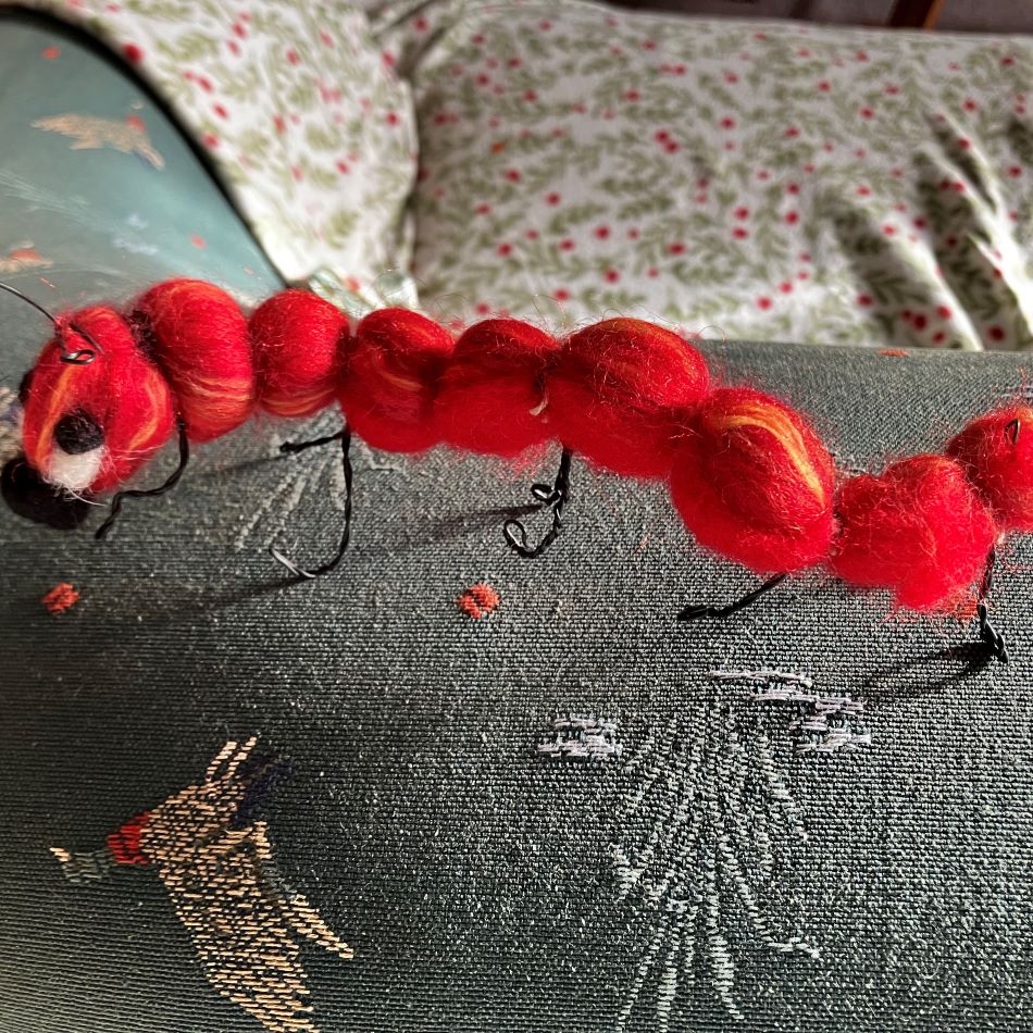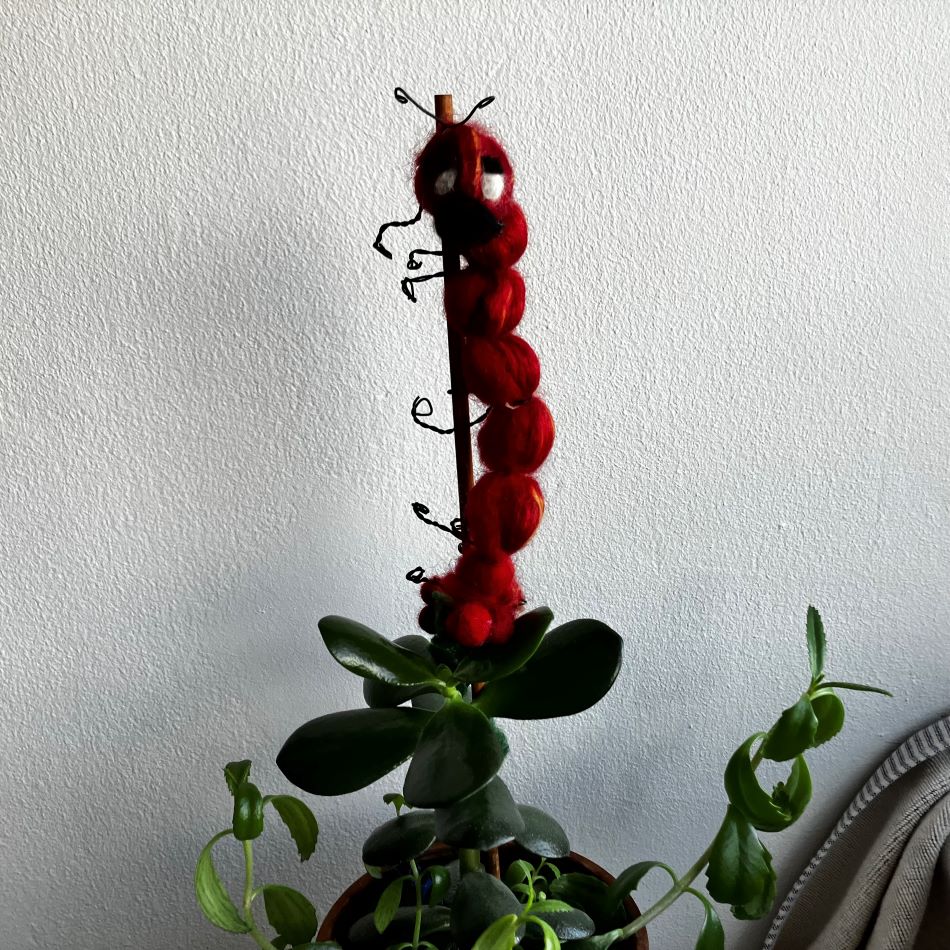 Härlig flerfotig insekt i röd ull för dekoration inomhus.