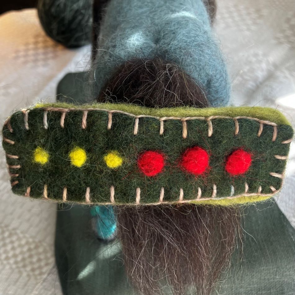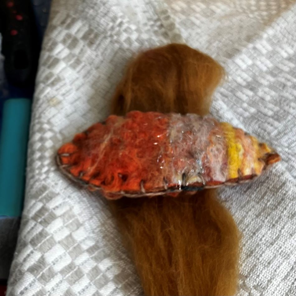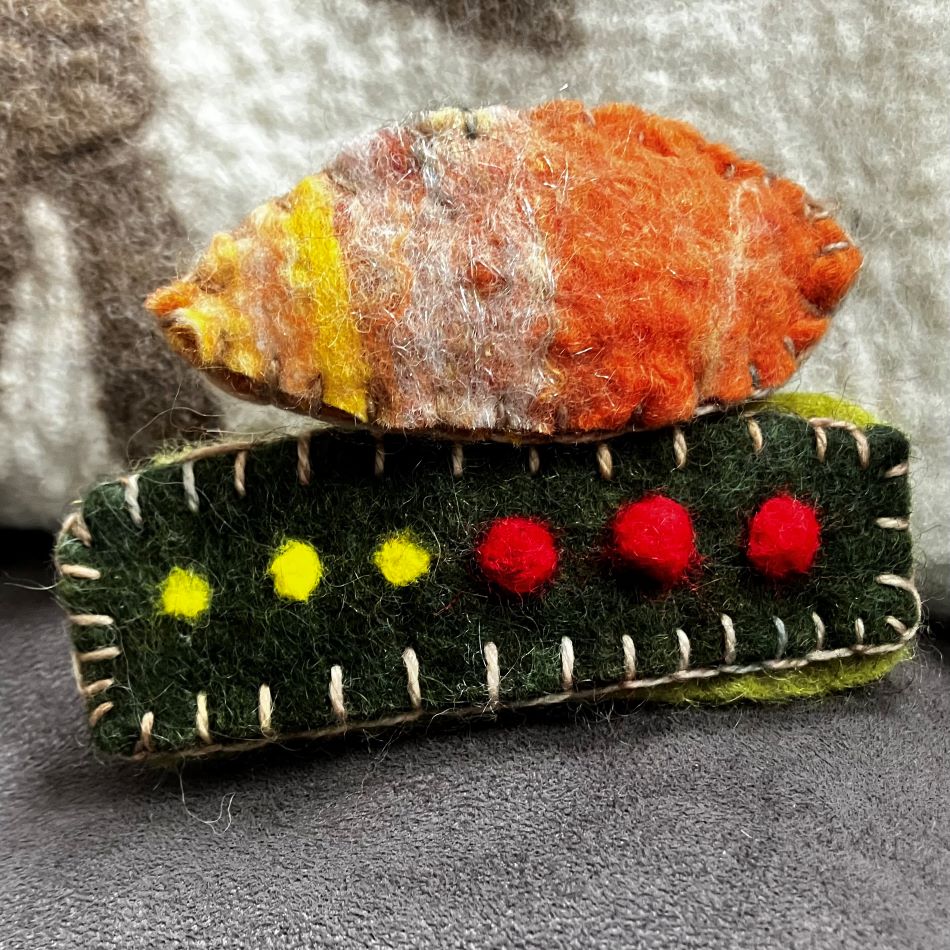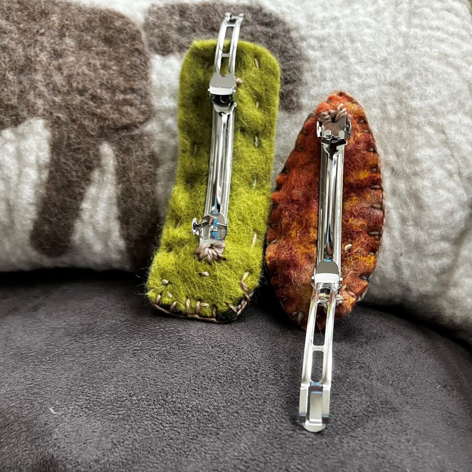 Handgjorda hårspännen utav filtad ull dekorerad med nålfiltad ull. Spännet är av metall. Tillvaratagen spill från olika ullprojekt. Varje spänne är en unikprodukt. Säljs i ett par. 2 spännen väger cirka 15 gr och är cirka mellan 8-10 cm bredd (metallspännet är cirka 6-7 cm långt) Design Nettans Ullisar