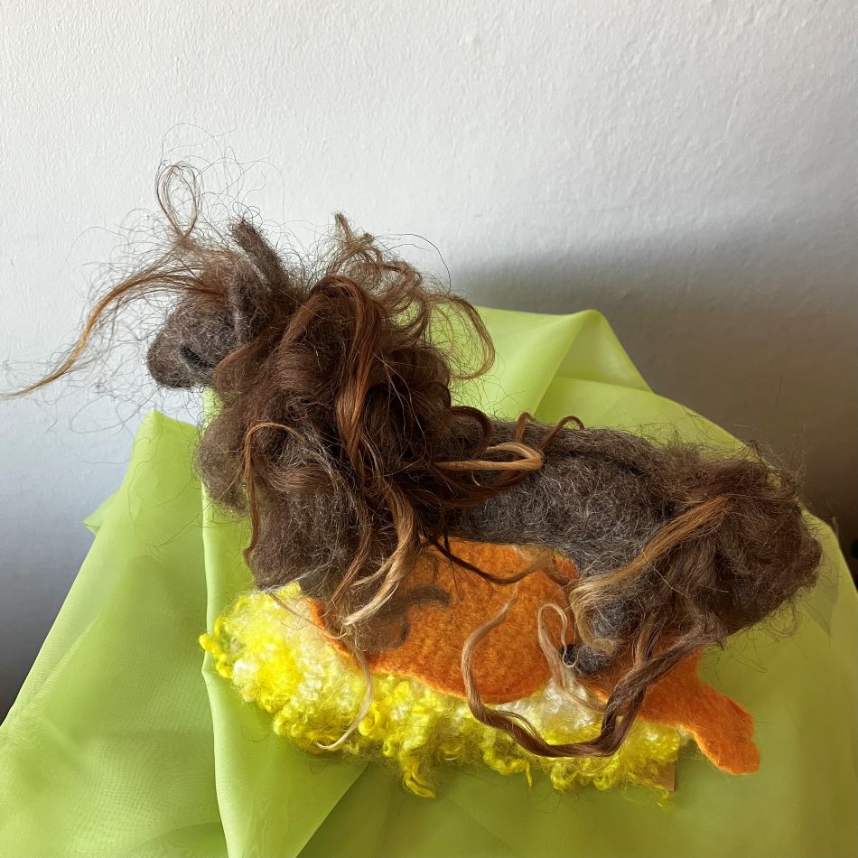 Denna häst är nåltovad eller nålfiltad i ull. Kroppen är uppbyggd runt en ståltråd. Ullen är svensk av gotlandsfår/leicester och man och svans är av svenskt ryafår. Jag kallar den Hrimfaxi ett fornnordiskt namn. Han står stolt på en liten piedestal som även den är med lockar av finull och en härligt våttovad ullfilt i finull. Totalt väger den 60 gr och Hrimfaxi är i kroppen längd cirka 13 cm höjd cirka 17 cm. Han är fastsydd i sina fina hovar på piedestalen som är av foam. Huvudet kan du ändra i lite olika positioner. Även benen går att ändra lite försiktigt om det behövs för att balansera upp honom. Design Nettans Ullisar och av Hrimfaxi finns det endast ett exemplar.
