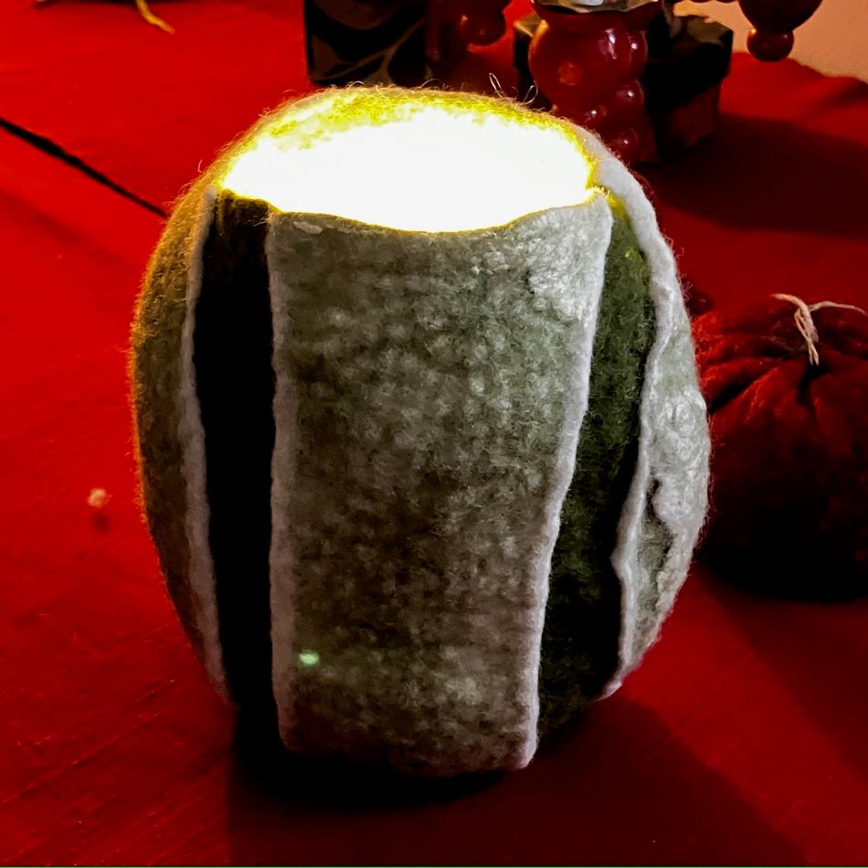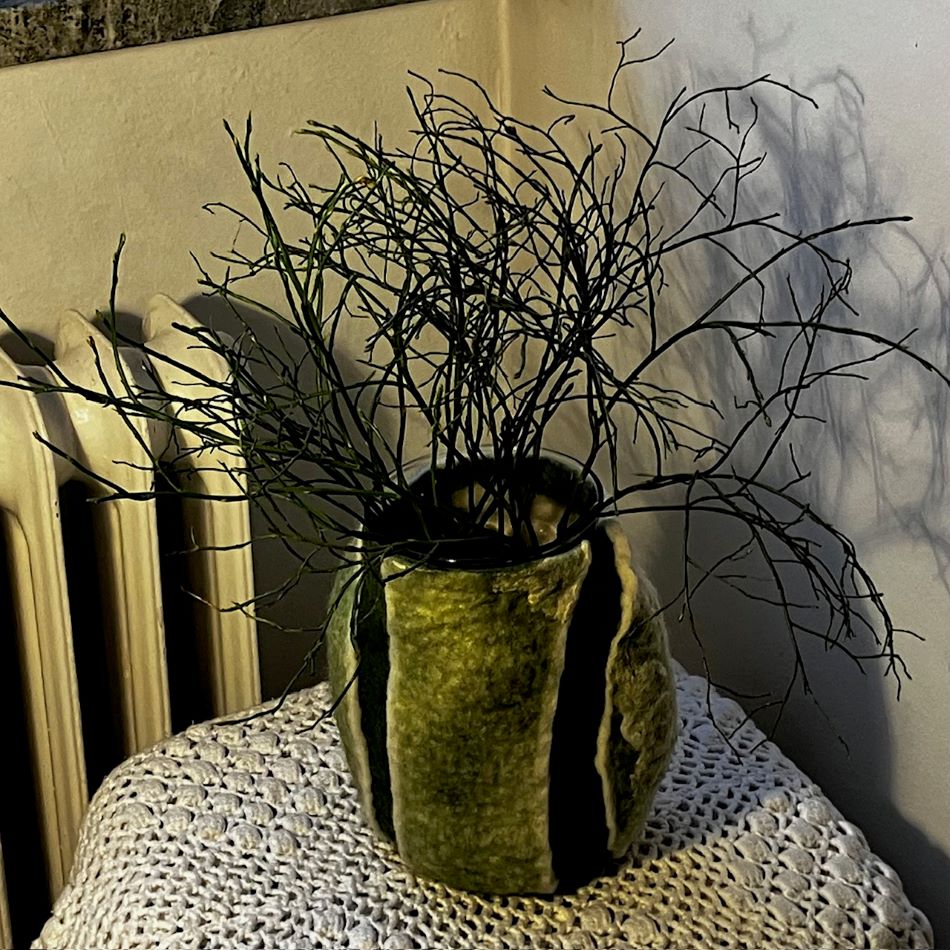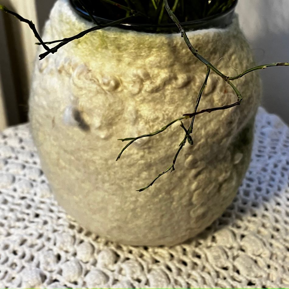 En ovalformad vas i finaste svensk ull. Grön och vit. Du kan använda olika sidor på vasen beroende på om du vill ha färg eller endast en vit sida. Den vita sidan är även genomskinlig så du kan få en vacker ljuslykta. Vasem väger cirka 60 gr och är 16 cm hög och bred.