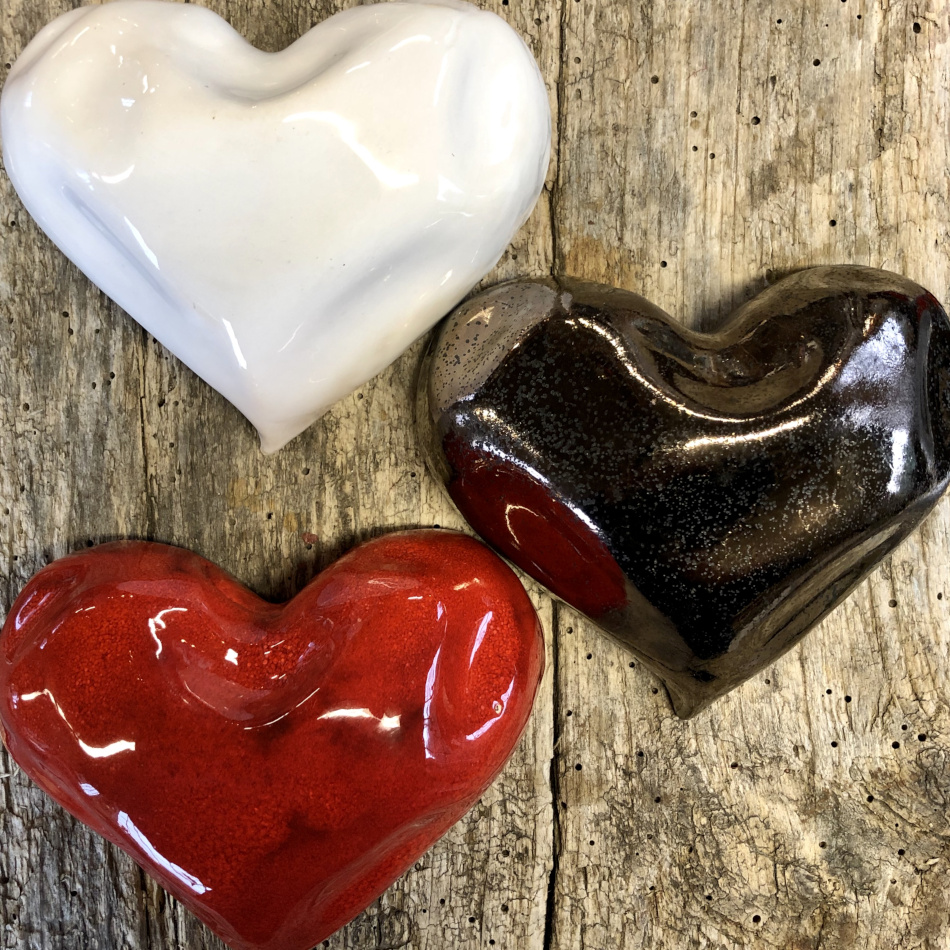 Dessa hjärtan tillverkas för hand i glaserat lergods, i ateljén på Gotland. De kan variera i form och i glasyrens nyans, vilket gör varje hjärta unikt. De bilder som visas är exempel på hur de kan se ut.