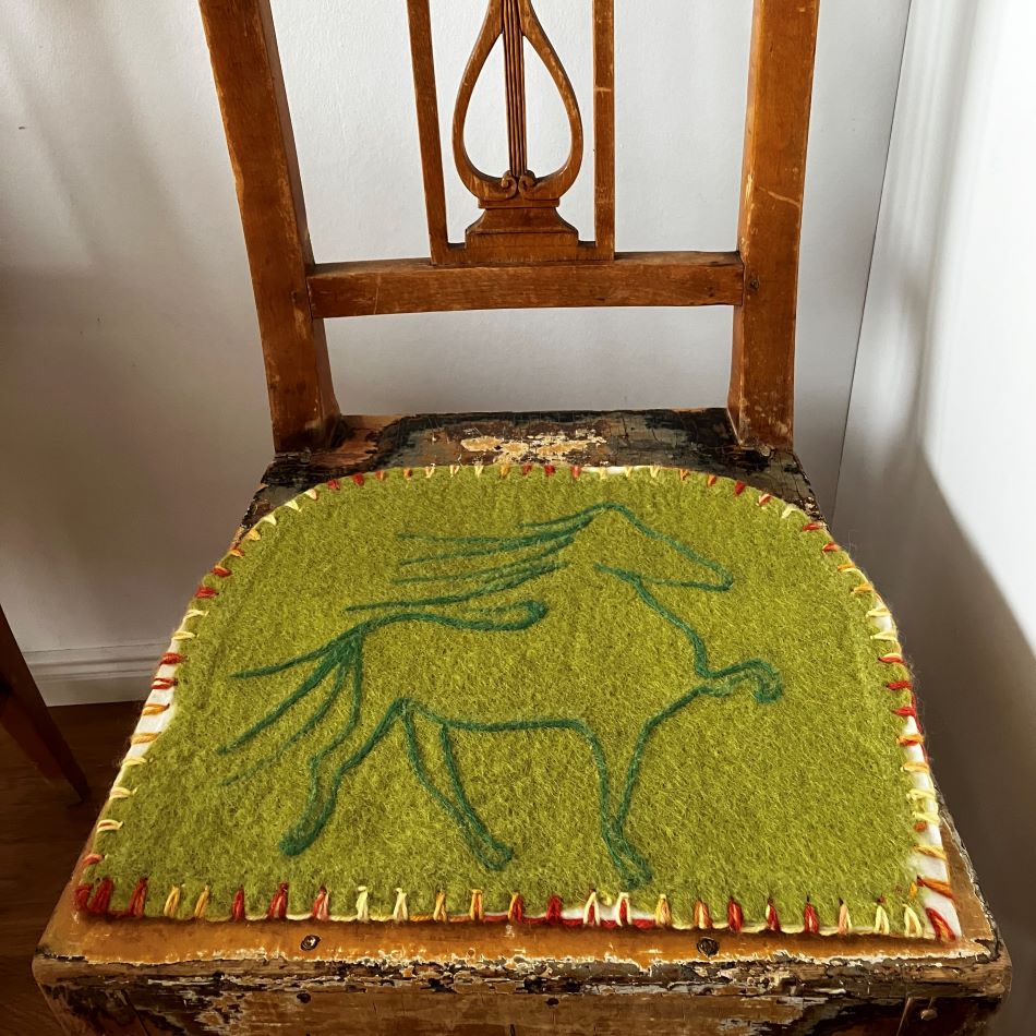 Värmande sittunderlag i svensk ull. Perfekt att ha med på picknicken eller att lysa upp utemöblerna på altan eller kanske ha som sittdyna på köksstolen. Design islandshästar av Nettans Ullisar. Kan göras i många olika färger. Just nu finns den i limegrön lecister ull. Baksidan är i merinoullfilt även där dekorerad med en töltande islandshäst. Nätt modell, bredd 38 cm och höjd 28 cm.Egen designavNettansUllisar.