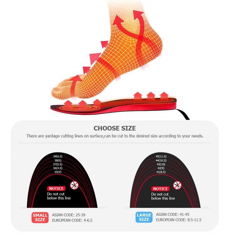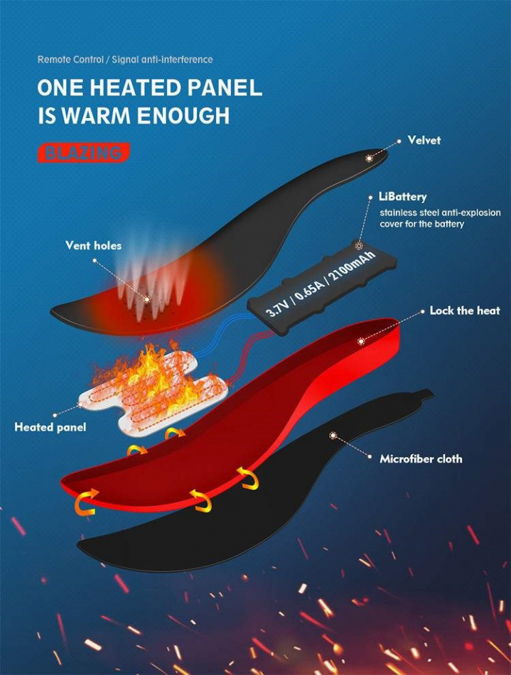fAktivera de trådlösa inläggssulorna enkelt med fjärrkontrollen och värmen sprider sig i främre delen av foten, under trampdynan där värmeslingorna sitter. Är tårna varma, så brukar resten av foten också vara varm. Det inbyggda värmesystemet genererar värme i ca 6 timmar per laddning. Sulorna är vattenresistenta, slitstarka, diskreta och fungerar helt utan störande kablar & batteripack eftersom allt är integrerat i själva sulan.Värmesulorna kan användas i det mesta som exempelvis – stövlar, kängor, pjäxor, skridskor till rymliga joggingskor.De uppvärmda sulorna är mjuka och har en dämpande effekt.