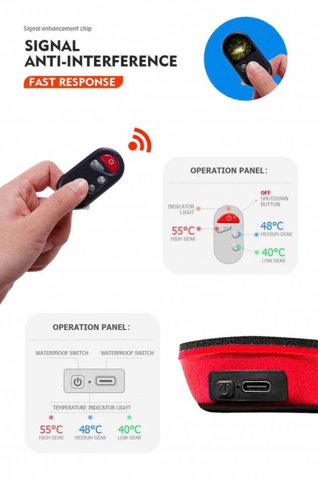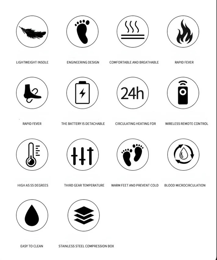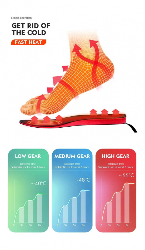 Temperaturen på värmesulorna kan ställas in i 3 olika lägen:Hög: Ca: 55 °C Ca: 2 timmar Mellan: Ca: 50 °C Ca: 3,5 timmar Låg: Ca: 40°C Ca: 6 timmar. Värmesulorna drivs av högpresterande litiumjonbatterier (Li-ion) som sitter ingjutna i hälen.