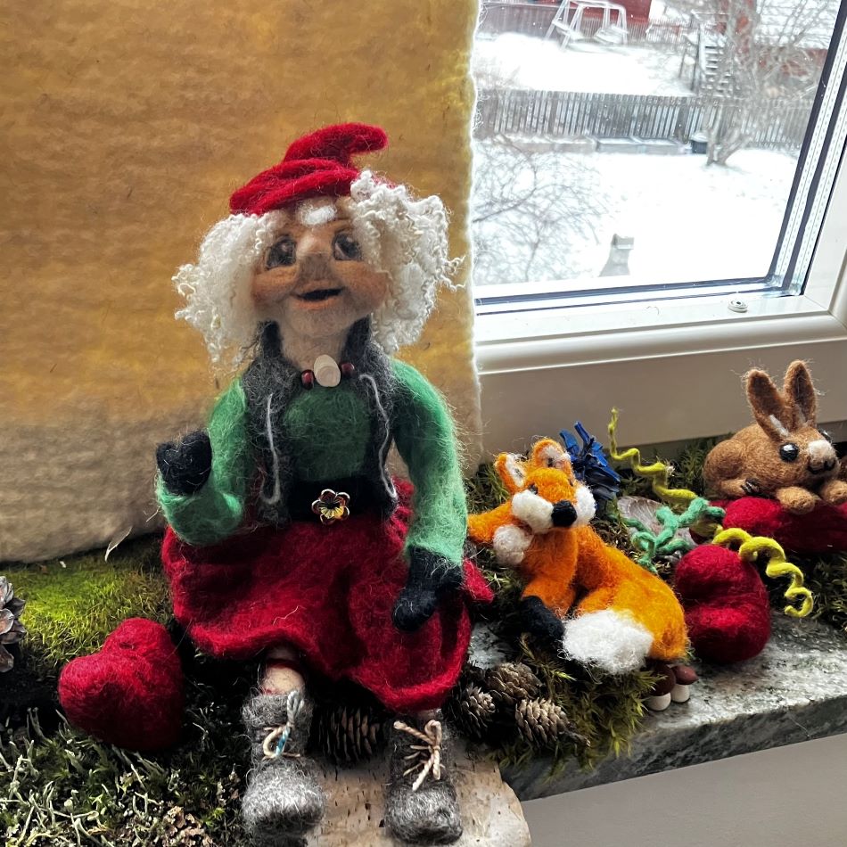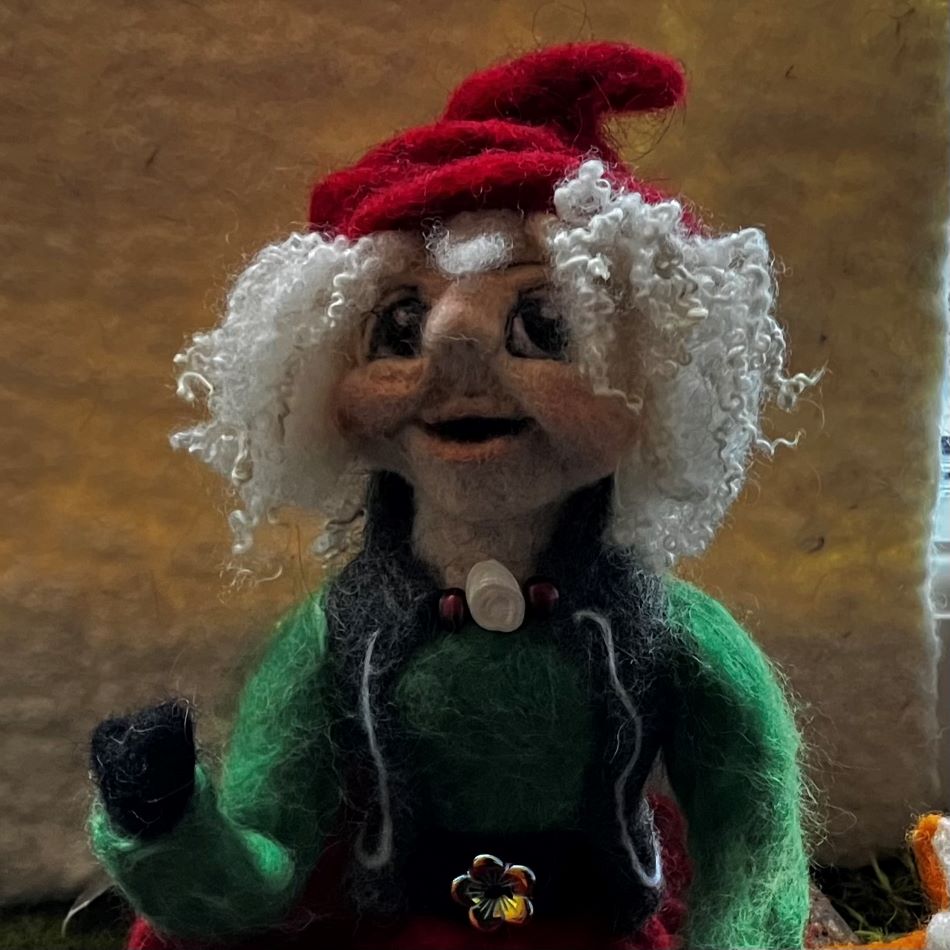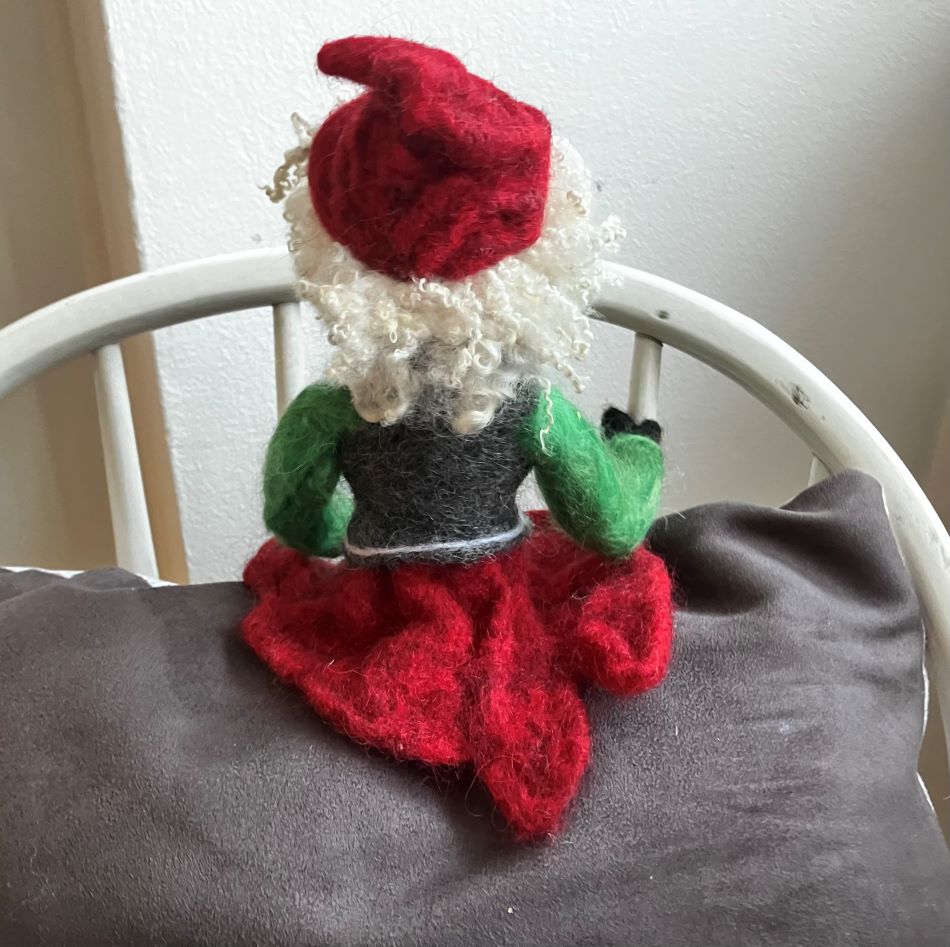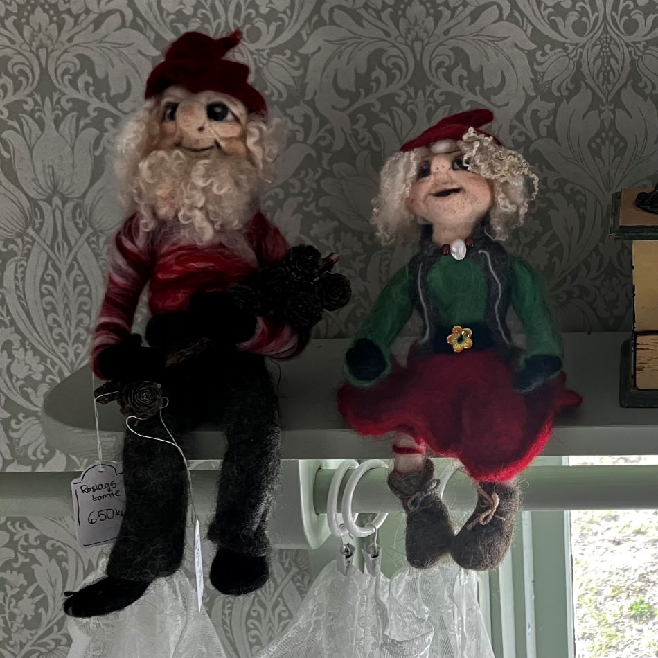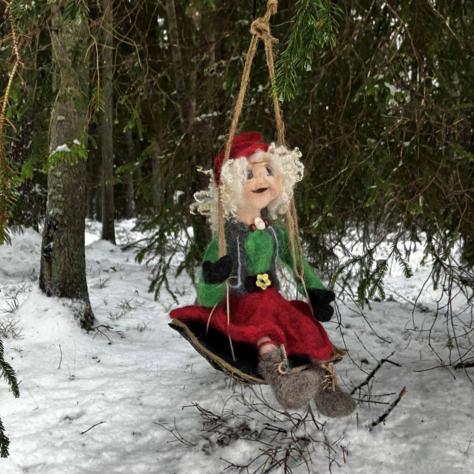 Småfolk, vättar, hustomte - ja många namn har dessa små mystiska varelser. Roslagsnissan är handgjord i svensk ull och hennes kropp är uppbyggd runt en stålvajer. Hon sitter helst på sin gunga men man kan naturligtvis sätta henne på vad som helst. Hon väger cirka 80 gr och med gunga cirka 43 gr. Sittande är hon cirka15 cm hög och total längd 30 cm. Roslagsnissan är nålfiltad eller torrtovad som en del säger i sittande position men du kan ändra riktining på armar och ben.