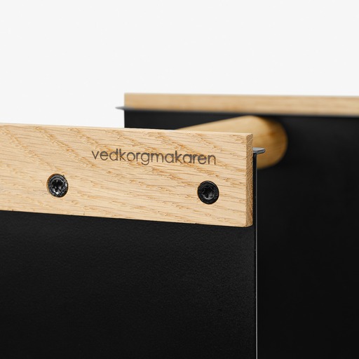 Vedkorgarna, som ibland kallas vedhämtare, är utvecklade i Sverige. De är tillverkade i Sverige av 1,5 mm plåt bockad så de bär varandra. Lösningen har vi sökt mönsterskydd för. Eklister håller den övre korgen på plats och handtaget är ek i form av rundstav (33 mm). Kvaliteten tummar vi inte på, plåten är pulverlackad och ekmaterialet är skyddat med OSMO hårdvaxolja. En korg väger 2,9 kilo och är 38 cm hög 20 cm bred och 25 cm djup.