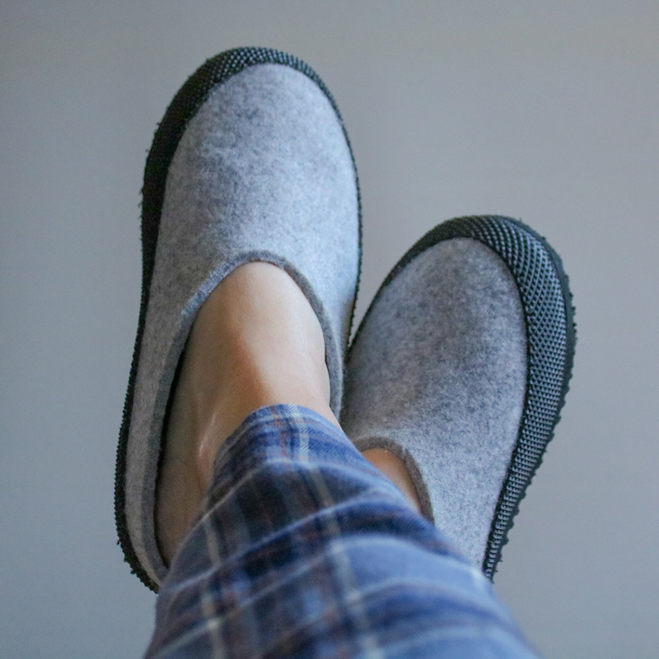 En slip-in toffel med riktig gummisula för användning både ute och inne.