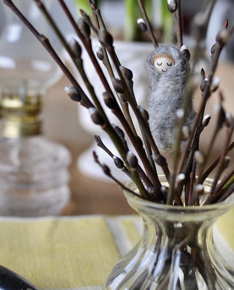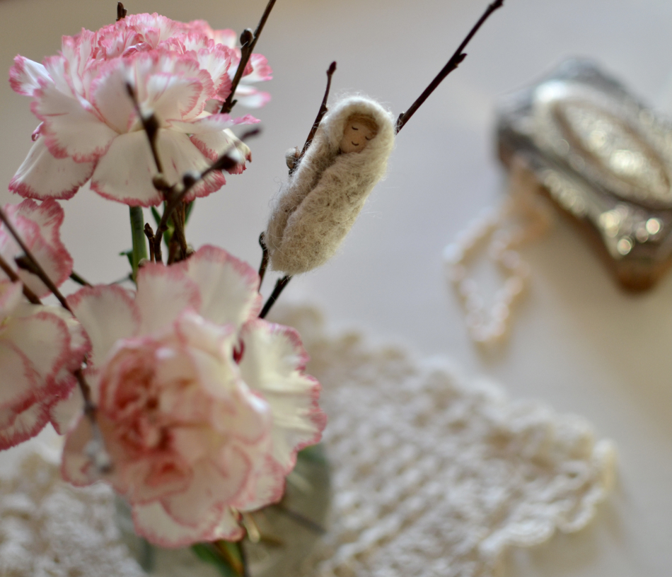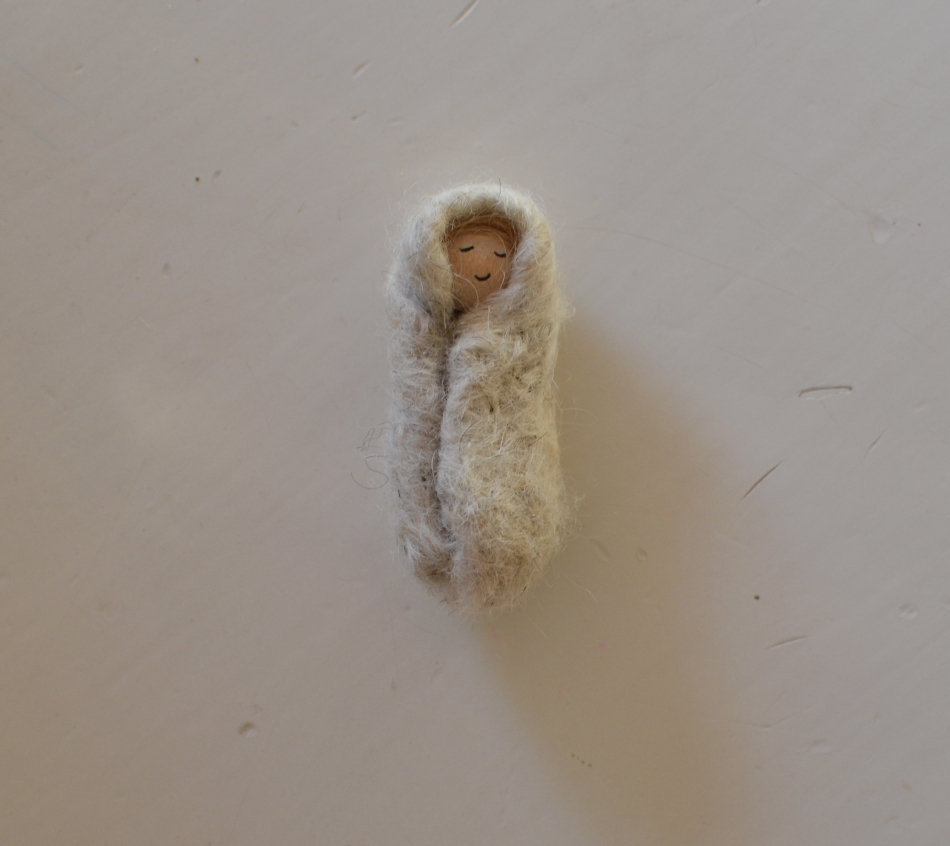 Kropp av svensk ull och huvud av trä. Metalltråd på baksidan för att fästa i.