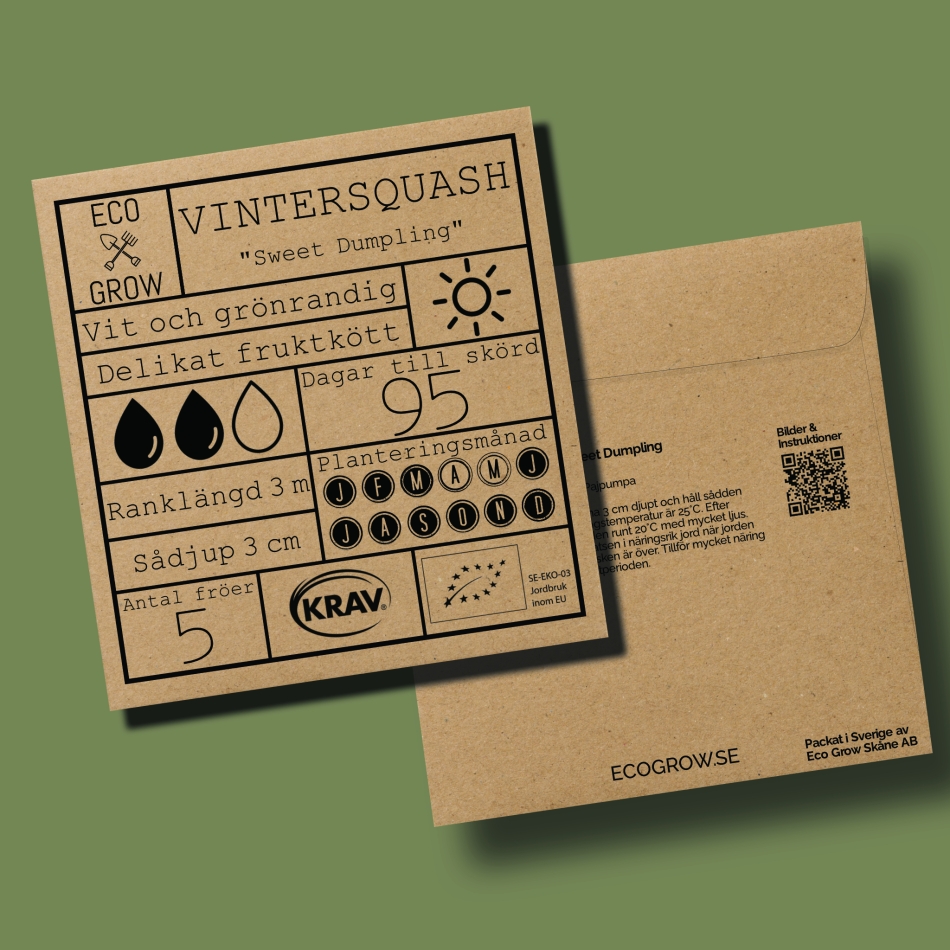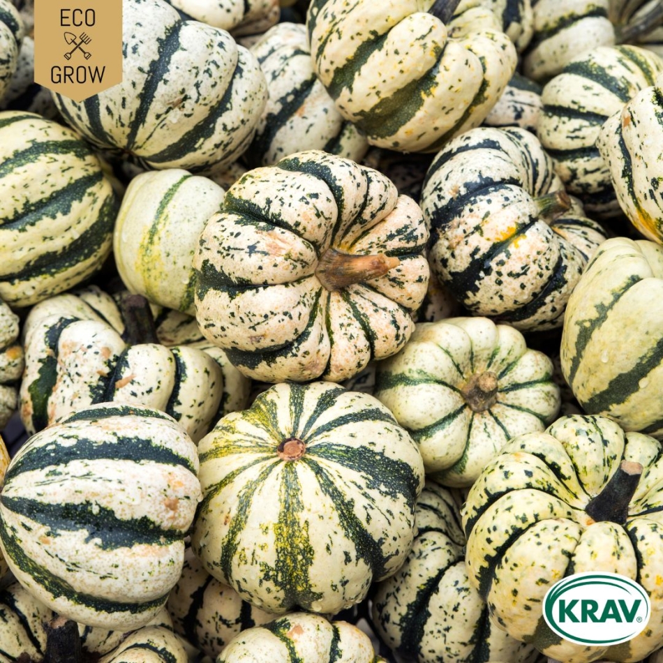 En liten, dekorativ vintersquash med gräddvit skal och mörkgröna ränder. De plattrunda frukterna väger 200–300 gram och har smörgult, sött och lent fruktkött med små frön – en riktig delikatess. Perfekt att fylla och ugnsbaka i halvor. Ger upp till 8–10 frukter under en varm sommar och går att lagra med gott resultat i 3–4 månader. Lika fin tillagad som till höstdekoration.