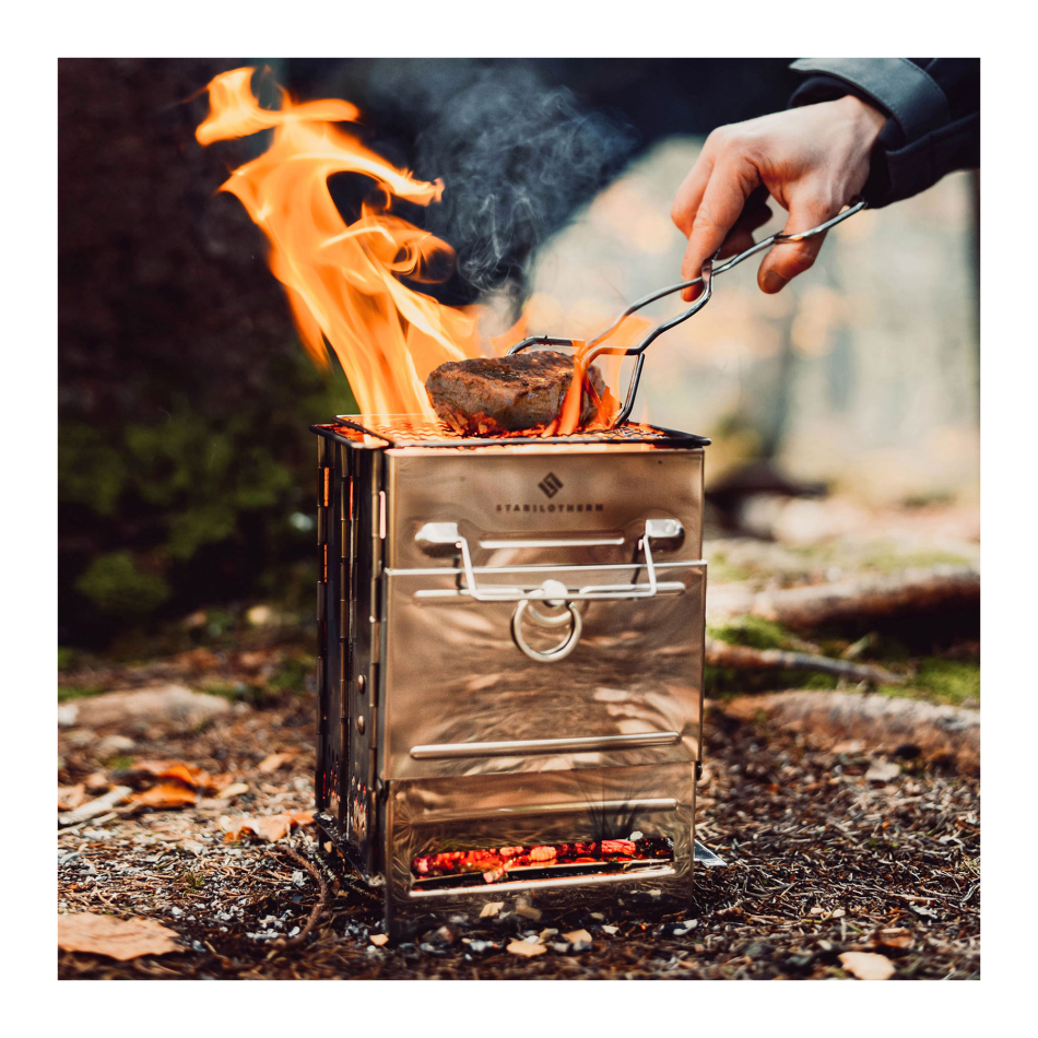 Den smidiga konstruktionen gör den väldigt enkel och snabb att montera. Det är det bara att fälla upp den, sätta dit medföljande grillgaller och askbricka och börja elda med det som naturen har att erbjuda. Enkel att fylla på med kvistar och pinnar under matlagningen. Den kubiska designen skapar en stadig yta. Den medföljande askbrickan skyddar underlaget mot att brännas.